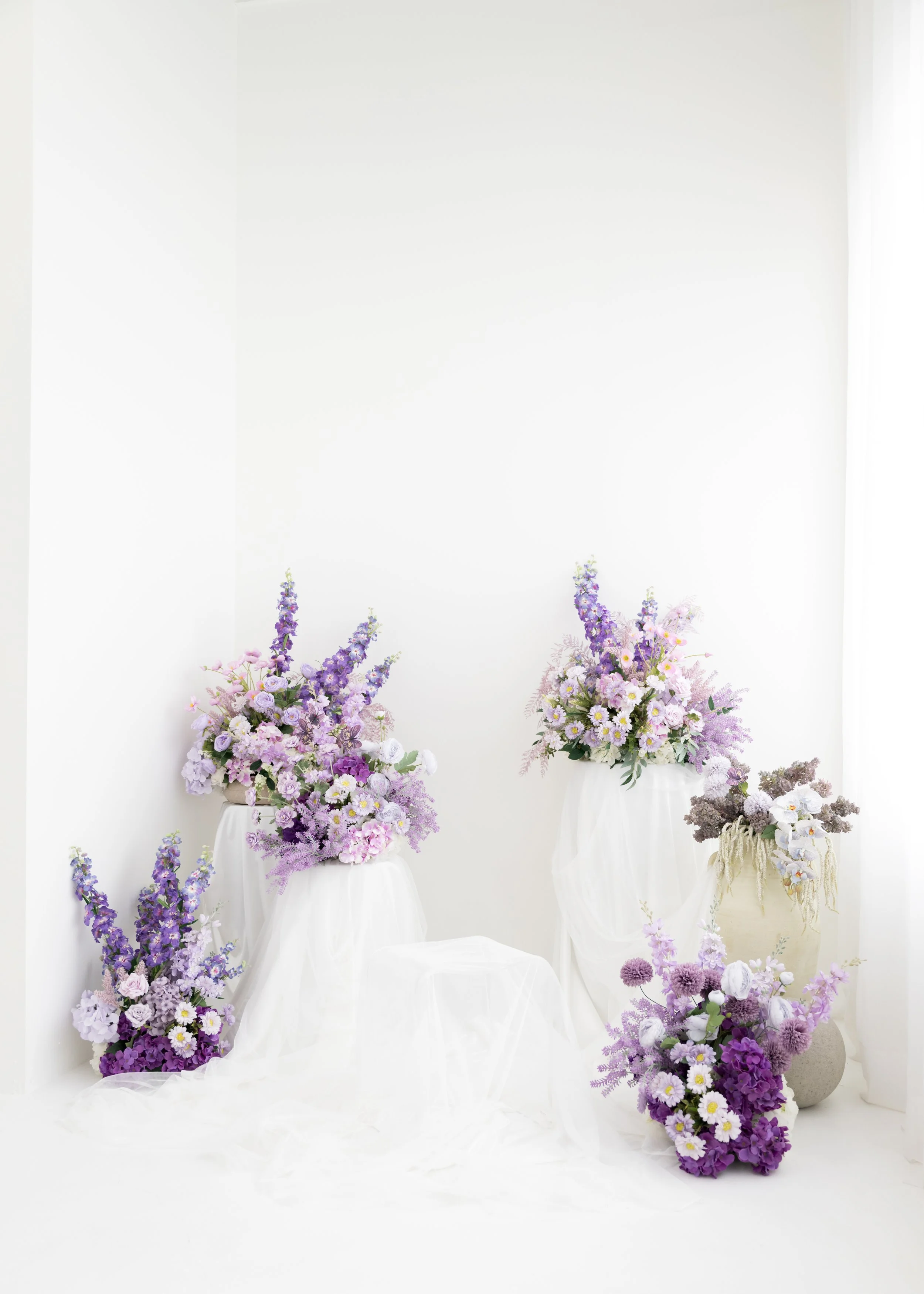 Bright and light filled, this minimalistic space fosters creativity through composition and lighting. White 14ft walls and sheer curtains over our large south west facing windows, act as the perfect diffusion and bounce for soft and dreamy lighting