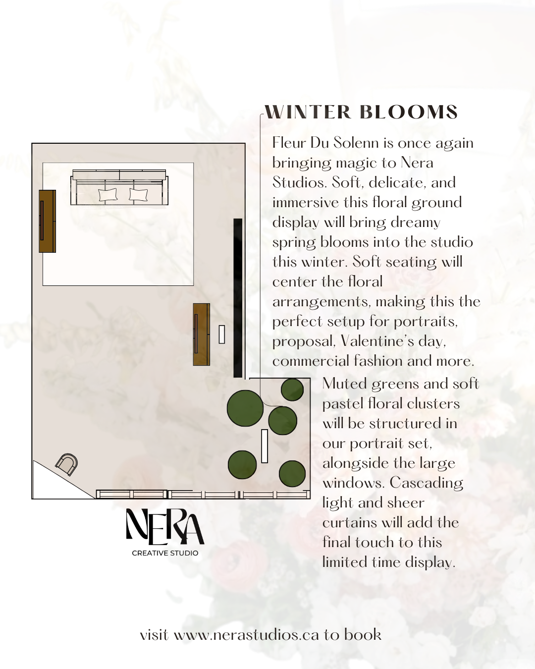Our winter blooms seasonal set-up is displayed in our portrait area alongside the windows. This set is moveable so you can customize the space to your concept.